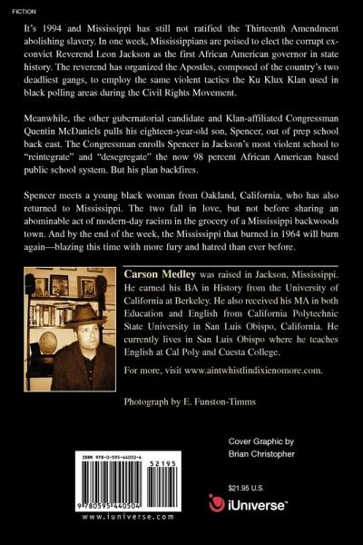 It's 1994 and Mississippi has still not ratified the Thirteenth Amendment abolishing slavery. In one week, Mississippians are poised to elect the corrupt ex-convict Reverend Leon Jackson as the first African American governor in state history. The reverend has organized the Apostles, composed of the country's two deadliest gangs, to employ the same violent tactics the Ku Klux Klan used in black polling areas during the Civil Rights Movement. Meanwhile, the other gubernatorial candidate and Klan-affiliated Congressman Quentin McDaniels pulls his eighteen-year-old son, Spencer, out of prep school back east. The Congressman enrolls Spencer in Jackson's most violent school to "reintegrate" and "desegregate" the now 98 percent African American based public school system. But his plan backfires. Spencer meets a young black woman from Oakland, California, who has also returned to Mississippi. The two fall in love, but not before sharing an abominable act of modern-day racism in the grocery of a Mississippi backwoods town. And by the end of the week, the Mississippi that burned in 1964 will burn again-blazing this time with more fury and hatred than ever before.
