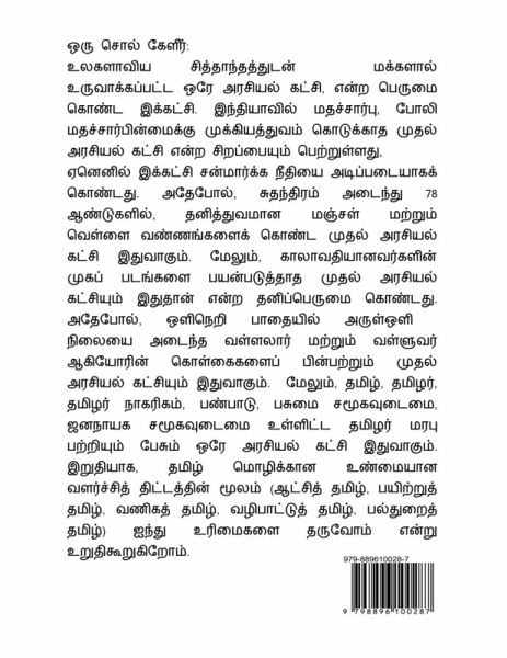 ¿It is the only political party formed by the people with a global ideology. It is also the first political party in India to dismiss fake secularism as it is secularism based on righteous justice. Similarly, in 78 years of independence, it is the first political party to have distinctive yellow and white colors. It is also the first political party not to use face pictures of outdated people. It is also the first political party to follow the ideals of Vallalar and Valluvar who attained the state of Aruloli on the path of light. It is the only political party discussing Tamils, Tamil civilization, culture, green socialism, and democratic socialism. Finally, through the original development plan for the Tamil language (Administrative Tamil, instructional Tamil, Commercial Tamil, liturgical Tamil, and Multidisciplinary Tamil) we will give five rights. ¿ ¿
