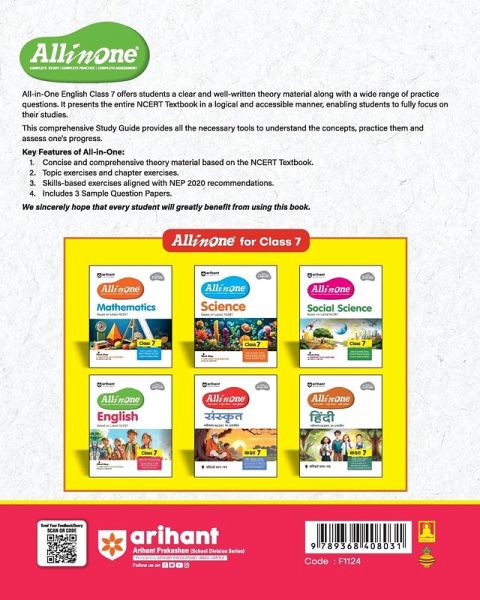 Unlock the world of English with Arihant's "All in One Class 7 English," meticulously designed to give young minds a comprehensive and structured learning experience. This study guide is based on the latest NCERT curriculum, covering the key themes in NCERT. The book features; ¿ Latest NCERT Content: Covers essential concepts with structured explanations to meet the curriculum's standards. ¿ Chapter Introduction: Provides a quick overview of the chapter, setting the foundation for what students will learn. ¿ Review & Assessment Exercise: Chapter exercise has all types of questions ¿ Mind Maps: Visual tools for quick revision, summarizing each chapter's key points for effortless recall. ¿ NCERT Folder: Detailed solutions to all NCERT textbook questions, helping students solidify their understanding and preparation. All in one series is designed to Skyrocket Your Grades with All-in-One Excellence by providing One-stop solution for all your exam needs with Curated content designed for exam success, Boost your retention and excel effortlessly. Tailored for Every Learner with Clear, concise concepts for all learning styles, from basics to advanced: we've got you covered. Why Choose Arihant Intelligence? Because with us, you'll find everything you need to succeed. No more juggling multiple resources or wasting time searching for the right material. Arihant Intelligence: Where Smart Students Go to Excel, Ready to transform your exam preparation? Get into the world of Arihant Intelligence today and experience the difference!