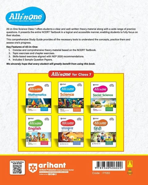 Unlock the world of Science with Arihant's "All in One Class 7 Science," meticulously designed to give young minds a comprehensive and structured learning experience. This study guide is based on the latest NCERT curriculum, covering the key themes in NCERT. The book features; ¿ Latest NCERT Content: Covers essential concepts with structured explanations to meet the curriculum's standards. ¿ Chapter Introduction: Provides a quick overview of the chapter, setting the foundation for what students will learn. ¿ Science Insight: Additional information enriching students' understanding of each concept. ¿ Box Matter: Highlights daily life phenomena related to the given concept in easy-to-spot boxes, emphasizing important points. ¿ Illustrative Figures: Diagrams are placed strategically to break the complexity of the concept. ¿ Try These: Engaging questions placed within the text to reinforce learning and promote active reading. ¿ Science Glossary: Easy-to-understand definitions and explanations of key terms and concepts. ¿ Mind Maps: Visual tools for quick revision, summarizing each chapter's key points for effortless recall. ¿ Let's Investigate: Contains scientific activity with complete procedural details to connect the theory to related practical aspects. ¿ NCERT Folder: Detailed solutions to all NCERT textbook questions, helping students solidify their understanding and preparation. ¿ Review Exercise: Chapter exercise has all types of questions. ¿ NEP 2020 Based Exercise: Questions based on elements/skills given in NEP 2020. Assessment Exercise: Complete test of the chapter in Exam Format. All in one series is designed to Skyrocket Your Grades with All-in-One Excellence by providing One-stop solution for all your exam needs with Curated content designed for exam success, Boost your retention and excel effortlessly. Tailored for Every Learner with Clear, concise concepts for all learning styles, from basics to advanced: we've got you covered. Why Choose Arihant Intelligence? Because with us, you'll find everything you need to succeed. No more juggling multiple resources or wasting time searching for the right material. Arihant Intelligence: Where Smart Students Go to Excel, Ready to transform your exam preparation? Get into the world of Arihant Intelligence today and experience the difference!