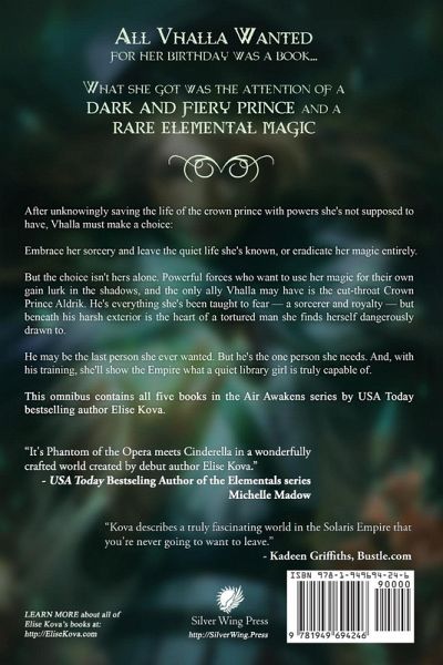 This *omnibus edition* contains all five books in the Air Awakens series by USA Today bestselling author Elise Kova.It is all five books bound as one, large manuscript. All Vhalla wanted for her seventeenth birthday was a book... What she got was the attention of a dark and fiery prince and a rare elemental magic. After unknowingly saving the life of the crown prince with powers she's not supposed to have, Vhalla must make a choice: Embrace her sorcery and leave the quiet life she's known, or eradicate her magic entirely. But the choice isn't hers alone. Powerful forces who want to use her magic for their own gain lurk in the shadows, and the only ally Vhalla may have is the cut-throat Crown Prince Aldrik. He's everything she's been taught to fear - a sorcerer and royalty - but beneath his harsh exterior is the heart of a tortured man she finds herself dangerously drawn to. He may be the last person she ever wanted. But he's the one person she needs. And, with his training, she'll show the Empire what a quiet library girl is truly capable of.