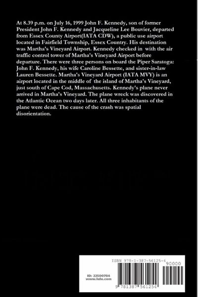 At 8:39 p.m. on July 16,1999 John F. Kennedy, son of former President John F. Kennedy and Jacqueline Lee Bouvier, departed from Essex County Airport (IATA:CDW), New Jersey. His destination was Martha's Vineyard Airport, just south of Cape Cod. There were three persons on board the Piper Saratoga: John F. Kennedy Jr, his wife Carolyn Bessette, and sister-in-law Lauren Bessette. The plane never arrived in Martha's Vineyard. The plane wreck was discovered in the Atlantic Ocean two days later. All three inhabitants of the plane were dead. The cause of the crash was spatial disorientation.