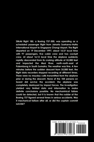 On 19 December 1997 SilkAir Flight 185, a Boeing 737-300, operated by SilkAir, Singapore, on its way from Jakarta to Singapore, crashed at about 16:13 local time into the Musi river near Palembang, South Sumatra. All 97 passengers and seven crew members were killed. Prior to the sudden descent from 35,000 feet, the flight data recorders stopped recording at different times. There were no mayday calls transmitted from the airplane prior or during the rapid descent. The weather at the time of the crash was fine.