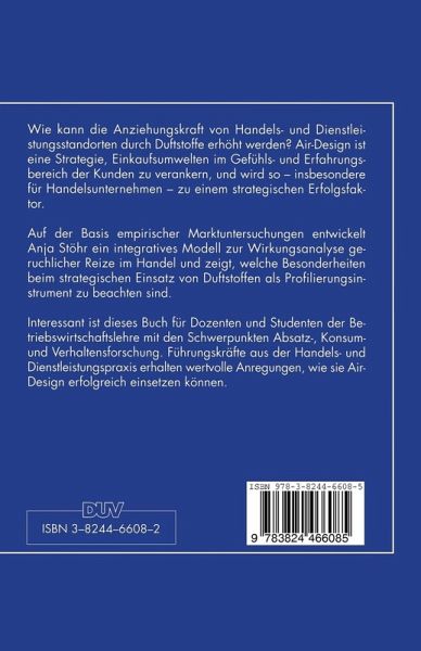 Wie kann die Anziehungskraft von Handels- und Dienstleistungsstandorten durch Duftstoffe erhöht werden? Air Design ist eine Strategie, die Einkaufsumwelten im Gefühls- und Erfahrungsbereich der Kunden zu verankern, und wird so - insbesondere für Handelsunternehmen - zu einem strategischen Erfolgsfaktor. Auf der Basis empirischer Marktuntersuchungen entwickelt Anja Stöhr ein integratives Modell zur Wirkungsanalyse geruchlicher Reize im Handel und zeigt, welche Besonderheiten beim strategischen Einsatz von Duftstoffen als Profilierungsinstrument zu beachten sind.
