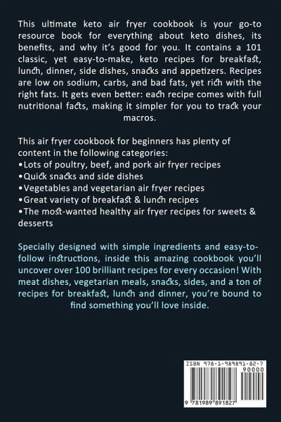 This ultimate keto air fryer cookbook is your go-to resource book for everything about keto dishes, its benefits, and why it's good for you. It contains a 101 classic, yet easy-to-make, keto recipes for breakfast, lunch, dinner, side dishes, snacks and appetizers. Recipes are low on sodium, carbs, and bad fats, yet rich with the right fats. It gets even better: each recipe comes with full nutritional facts, making it simpler for you to track your macros. This air fryer cookbook for beginners has plenty of content in the following categories: Lots of poultry, beef, and pork air fryer recipes Quick snacks and side dishes Vegetables and vegetarian air fryer recipes Great variety of breakfast & lunch recipes The most-wanted healthy air fryer recipes for sweets & desserts Specially designed with simple ingredients and easy-to-follow instructions, inside this amazing cookbook you'll uncover over 100 brilliant recipes for every occasion! With meat dishes, vegetarian meals, snacks, sides, and a ton of recipes for breakfast, lunch and dinner, you're bound to find something you'll love inside.