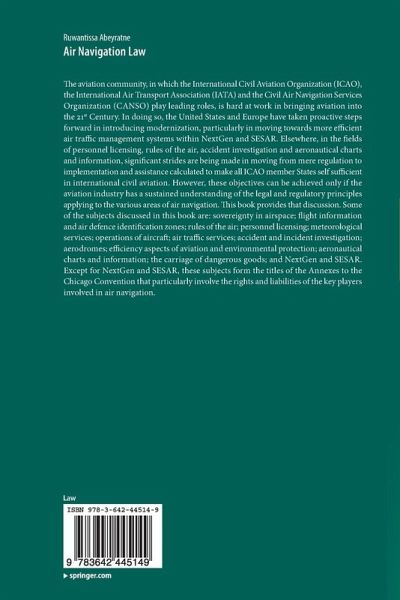 The aviation community, in which the International Civil Aviation Organization (ICAO), the International Air Transport Association (IATA) and the Civil Air Navigation Services Organization (CANSO) play leading roles, is hard at work in bringing aviation into the 21st Century. In doing so, the United States and Europe have taken proactive steps forward in introducing modernization, particularly in moving towards more efficient air traffic management systems within NextGen and SESAR. Elsewhere, in the fields of personnel licensing, rules of the air, accident investigation and aeronautical charts and information, significant strides are being made in moving from mere regulation to implementation and assistance calculated to make all ICAO member States self sufficient in international civil aviation. However, these objectives can be achieved only if the aviation industry has a sustained understanding of the legal and regulatory principles applying to the various areas of air navigation. This book provides that discussion. Some of the subjects discussed in this book are: sovereignty in airspace; flight information and air defence identification zones; rules of the air; personnel licensing; meteorological services; operations of aircraft; air traffic services; accident and incident investigation; aerodromes; efficiency aspects of aviation and environmental protection; aeronautical charts and information; the carriage of dangerous goods; and NextGen and SESAR . Except for NextGen and SESAR, these subjects form the titles of the Annexes to the Chicago Convention that particularly involve the rights and liabilities of the key players involved in air navigation.