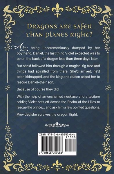 Dragons are safer than planes right? After being unceremoniously dumped by her boyfriend, Daniel, the last thing Violet expected was to be on the back of a dragon less than three days later. But she'd followed him through a magical fig tree and things had spiralled from there. She'd arrived, he'd been kidnapped, and the king and queen asked her to rescue Daniel-their son. Because of course they did. With the help of an enchanted necklace and a taciturn soldier, Violet sets off across the Realm of the Lilies to rescue the prince... and ask him a few pointed questions. Provided she survives the dragon flight.