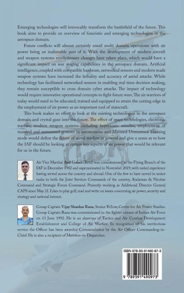 Emerging technologies will irrevocably transform the battlefield of the future. This book aims to provide an overview of futuristic and emerging technologies in the aerospace domain. Future conflicts will almost certainly entail multi domain operations with air power being an inalienable part of it. With the development of modern aircraft and weapon systems revolutionary changes have taken place, which would have a significant impact on war waging capabilities in the aerospace domain. Artificial intelligence, coupled with compatible hardware, networked sensors and modern made weapon systems have increased the lethality and accuracy of aerial attacks. While technology has facilitated networked sensors in enabling real time decision making, they remain susceptible to cross domain cyber attacks. The impact of technology would require innovative operational concepts to fight future wars. The air warriors of today would need to be educated, trained and equipped to retain the cutting edge in the employment of air power as an important tool of statecraft. This book makes an effort to look at the existing technologies in the aerospace domain and crystal gaze into the future. The effect of space technologies, electronic warfare, modern weapon systems including hypersonic missiles, employment of manned and unmanned systems in autonomous and Manned Unmanned Teaming mode would define the future of aerial warfare in general and give a sense as to how the IAF should be looking at certain key aspects of air power that would be relevant for us in the future. Air Vice Marshal Anil Golani (Retd) was commissioned in the Flying Branch of the IAF in December 1982 and superannuated in November 2019, with varied experience having served across the country and abroad. Group Captain Vijay Shankar Rana, Senior Fellow, Centre for Air Power Studies. Group Captain Rana was commissioned in the fighter stream of Indian Air Force on 13 June 1992.