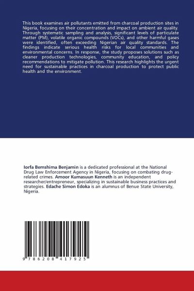This book examines air pollutants emitted from charcoal production sites in Nigeria, focusing on their concentration and impact on ambient air quality. Through systematic sampling and analysis, significant levels of particulate matter (PM), volatile organic compounds (VOCs), and other harmful gases were identified, often exceeding Nigerian air quality standards. The findings indicate serious health risks for local communities and environmental concerns. In response, the study proposes solutions such as cleaner production technologies, community education, and policy recommendations to mitigate pollution. This research highlights the urgent need for sustainable practices in charcoal production to protect public health and the environment.