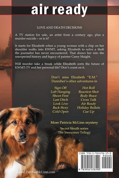 Love and death decisions Will murder take a break while Elizabeth Margaret Danniher sorts out the future of KWMT-TV and her personal life? Don't count on it. A young woman comes to Elizabeth at KWMT to solve a kind of theft Elizabeth has never encountered before. That's challenge enough, with the TV station for sale and the top candidate to buy it known for eliminating news departments. But Elizabeth also senses there something more bothering Hailey Newhall. And then there's Elizabeth's personal life . . . She is drawn to both enigmatic rancher Thomas Burrell and her former KWMT-TV colleague Mike Paycik, the home-town sports hero. But Mike has career aspirations of his own, and Tom has a feisty daughter who's definitely Team Dad. Meanwhile, Elizabeth's ace videographer, Diana Stendahl, who manages to juggle her demanding job, parenting two teens, and new love, challenges Elizabeth to also open her heart. Where will her heart lead her? Team Tom? Team Mike? You're finally going to find out the answer ... and so is Elizabeth. Air Ready, Book 12 of the Caught Dead in Wyoming series, is a smart, surprising, fast-paced cozy mystery with humor. If you like quirky characters, hints of romance and twists you won't see coming, then you'll love USA Today bestselling author Patricia McLinn's page-turner. Don't miss any of Elizabeth Danniher's Caught Dead in Wyoming adventures Sign Off Left Hanging Shoot First Last Ditch Look Live Back Story Cold Open Hot Roll Reaction Shot Body Brace Cross Talk Air Ready Holiday Bullets Cue Up "While the mystery itself is twisty-turny and thoroughly engaging, it's the smart and witty writing that I loved the best." - Diane Chamberlain, bestselling author "Colorful characters, intriguing, intelligent mystery, plus the state of Wyoming leaping off every page." -- Emilie Richards, USA Today bestselling author More Patricia McLinn mystery Secret Sleuth series Death on the Diversion Death on Torrid Avenue Death on Beguiling Way Death on Covert Circle Death on Shady Bridge Death on Carrion Lane Death on ZigZag Trail Death on Puzzle Place The Innocence Trilogy Proof of Innocence Price of Innocence Premise of Innocence