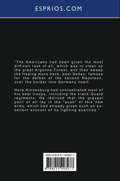 "The Americans had been given the most difficult task of all, which was to clean up the great Argonne Forest, and then sweep the fleeing Huns back, past Sedan, famous for the defeat of the second Napoleon, over the border into Germany itself. Here Hindenburg had concentrated most of his best troops, including the crack Guard regiments. He realized that the gravest peril of all lay in the "push" of this new army, which had already given such an excellent account of its fighting qualities."