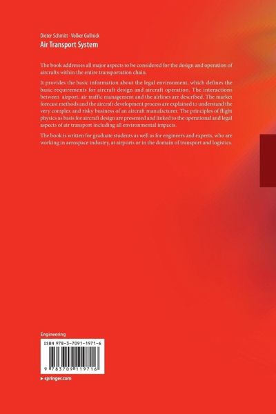 It provides the basic information about the legal environment, which defines the basic requirements for aircraft design and aircraft operation. The interactions between airport, air traffic management and the airlines are described. The market forecast methods and the aircraft development process are explained to understand the very complex and risky business of an aircraft manufacturer. The principles of flight physics as basis for aircraft design are presented and linked to the operational and legal aspects of air transport including all environmental impacts.