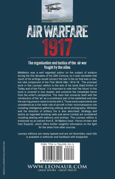 The organisation and tactics of the air war fought by the allies Middleton was a well regarded author on the subject of aviation during the first decades of the 20th Century, so it was inevitable that much of his writings would concern the war in the air that was a new, but vital component of the First World War, 1914-18. The principal work in this Leonaur edition is the text of his book titled,'Airfare of Today and of the Future'. It is important to note that 'the future' in this book is covered in one chapter and concerns the immediate future from the writer's perspective. The main text concerns itself with the introduction of the 'air' as a constituent part of the battlefield and how the warring powers came to terms with it. Those early experiments are considered as is the initial role of aircraft in their reconnaissance role including intelligence gathering utilising aerial photography. Wireless and the direction of artillery fire is also described. Strategy and tactics as regarded bombing raids and aerial combat are considered including dealing with balloons and airships. This Leonaur edition is enhanced by an extract from E. W Walters book, 'Heroic Airmen and their Exploits', which offers further insightful information on the fight for the skies from other sources. Leonaur editions are newly typeset and are not facsimiles; each title is available in softcover and hardback with dustjacket.