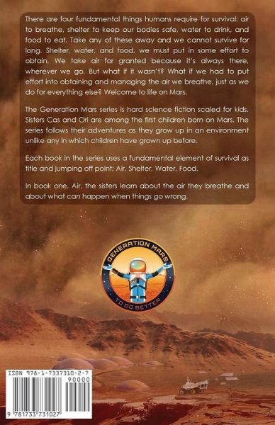 Red Ribbon Winner from The Wishing Shelf Book Awards There are four fundamental things humans require for survival: air to breathe, shelter to keep our bodies safe, water to drink, and food to eat. Take any of these away and we cannot survive for long. Shelter, water, and food, we must put in some effort to obtain. We take air for granted because it's always there, wherever we go. But what if it wasn't? What if we had to put effort into obtaining and managing the air we breathe, just as we do for everything else? Welcome to life on Mars. The Generation Mars series is hard science fiction scaled for kids. Sisters Cas and Ori are among the first children born on Mars. The series follows their adventures as they grow up in an environment unlike any in which children have grown up before. Each book in the series uses a fundamental element of survival as title and jumping off point: Air, Shelter, Water, Food. In book one, Air, the sisters learn about the air they breathe, and about what can happen when things go wrong. From the author: I am writing the Generation Mars series to give kids their first exposure to hard science fiction. Technically, that term simply means that the events of the stories are grounded in science. But, inevitably, it also means that the science can be hard. I've made an effort to ensure that the story is enjoyable even without a thorough understanding of the science involved. Terms are introduced in a way that should make their meaning obvious from context. The science section at the back is challenging, but I've made the important take-aways clear at the beginning of each section. I also have not held back in terms of vocabulary and grammatical style throughout the book. It is my experience that kids are able to enjoy reading levels far beyond what we expect, as long as the story keeps them engaged. I think this one will.
