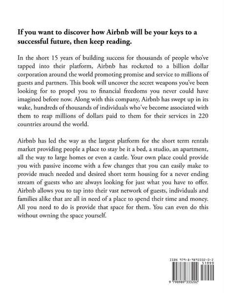 If you want to discover how Airbnb will be your keys to a successful future, then keep reading. In the short 15 years of building success for thousands of people who've tapped into their platform, Airbnb has rocketed to a billion dollar corporation around the world promoting promise and service to millions of guests and partners. This book will uncover the secret weapons you've been looking for to propel you to financial freedoms you never could have imagined before now. Along with this company, Airbnb has swept up in its wake, hundreds of thousands of individuals who've become associated with them to reap millions of dollars paid to them for their services in 220 countries around the world. Airbnb has led the way as the largest platform for the short term rentals market providing people a place to stay be it a bed, a studio, an apartment, all the way to large homes or even a castle. Your own place could provide you with passive income with a few changes that you can easily make to provide much needed and desired short term housing for a never ending stream of guests who are always looking for just what you have to offer. Airbnb allows you to tap into their vast network of guests, individuals and families alike that are all in need of a place to spend their time and money. All you need to do is provide that space for them. You can even do this without owning the space yourself.