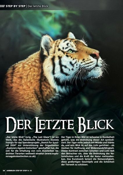 Airbrush Step by Step 95: Highlights Step by Steps: Porträt nach KI-Vorlage von Carlos Cartagena Cindy Lauper Porträt von Edith Davila Special Effects Porträt von Mariano Soto Lahr T-Shirt-Design von Olga Golubeva Tiger-Illustration von Daniela Frongia Interview: EX-QUISITAS: Künstlerische Leckerbissen von Luz de la Calle Airbrush Step by Step bietet Schritt-für-Schritt-Anleitungen in verschiedenen Schwierigkeitsgraden für Airbrush-Illustrationen, Custom Painting, Modellbau Bodypainting und andere Anwendungsbereiche. Es stellt aktuelle Produkte und neueste Techniken vor, präsentiert News und Berichte aus der Airbrush-Community und gibt Einblicke in die Werke und Arbeitsweisen von Künstlern weltweit.