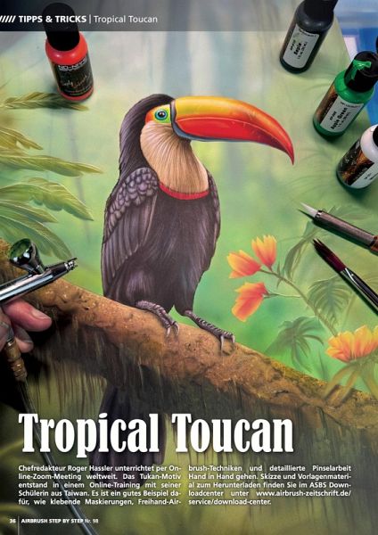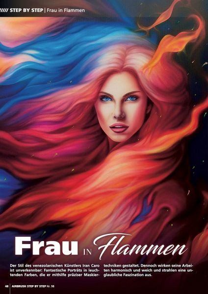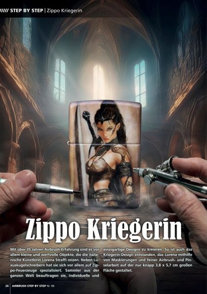 Step by Steps: SciFi-Porträt von Daniela Frongia Zippo-Bemalung von Lorena Straffi Metalflake-Motorrad-Design von Carsten Kleinbongard Feuereffekt-Porträt von Iran Caro Tropische Vodel-Illustration von Roger Hassler Interview: Die gemeinsame Airbrush-Leidenschaft von Lorena und Danilo Straffi Airbrush Step by Step bietet Schritt-für-Schritt-Anleitungen in verschiedenen Schwierigkeitsgraden für Airbrush-Illustrationen, Custom Painting, Modellbau Bodypainting und andere Anwendungsbereiche. Es stellt aktuelle Produkte und neueste Techniken vor, präsentiert News und Berichte aus der Airbrush-Community und gibt Einblicke in die Werke und Arbeitsweisen von Künstlern weltweit.