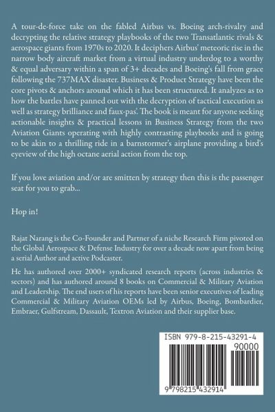 A tour-de-force take on the fabled Airbus vs. Boeing arch-rivalry and decrypting the relative strategy playbooks of the two Transatlantic rivals & aerospace giants from 1970s to 2020. It deciphers Airbus' meteoric rise in the narrow body aircraft market from a virtual industry underdog to a worthy & equal adversary within a span of 3+ decades and Boeing's fall from grace following the 737MAX disaster. Business & Product Strategy have been the core pivots & anchors around which it has been structured. It analyzes as to how the battles have panned out with the decryption of tactical execution as well as strategy brilliance and faux-pas'. The book is meant for anyone seeking actionable insights & practical lessons in Business Strategy from the two Aviation Giants operating with highly contrasting playbooks and is going to be akin to a thrilling ride in a barnstormer's airplane providing a bird's eyeview of the high octane aerial action from the top. If you love aviation and/or are smitten by strategy then this is the passenger seat for you to grab... Hop in!