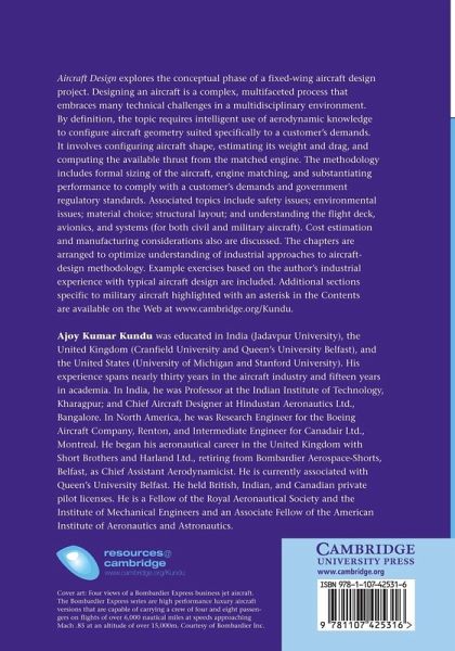Aircraft Design explores fixed winged aircraft design at the conceptual phase of a project. Designing an aircraft is a complex multifaceted process embracing many technical challenges in a multidisciplinary environment. By definition, the topic requires intelligent use of aerodynamic knowledge to configure aircraft geometry suited specifically to the customer's demands. It involves estimating aircraft weight and drag and computing the available thrust from the engine. The methodology shown here includes formal sizing of the aircraft, engine matching, and substantiating performance to comply with the customer's demands and government regulatory standards. Associated topics include safety issues, environmental issues, material choice, structural layout, understanding flight deck, avionics, and systems (for both civilian and military aircraft). Cost estimation and manufacturing considerations are also discussed. The chapters are arranged to optimize understanding of industrial approaches to aircraft design methodology. Example exercises from the author's industrial experience dealing with a typical aircraft design are included.