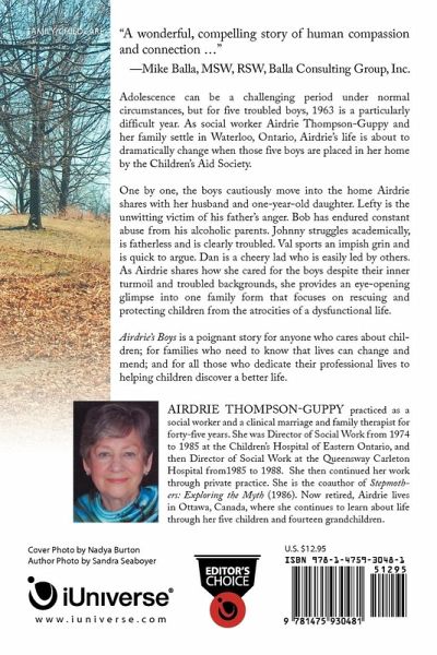 Adolescence can be a challenging period under normal circumstances, but for five troubled boys, 1963 is a particularly difficult year. As social worker Airdrie Thompson-Guppy and her family settle in Waterloo, Ontario, Airdrie's life is about to dramatically change when those five boys are placed in her home by the Children's Aid Society. One by one, the boys cautiously move into the home Airdrie shares with her husband and one-year-old daughter. Lefty is the unwitting victim of his father's anger. Bob has endured constant abuse from his alcoholic parents. Johnny struggles academically, is fatherless and is clearly troubled. Val sports an impish grin and is quick to argue. Dan is a cheery lad who is easily led by others. As Airdrie shares how she cared for the boys despite their inner turmoil and troubled backgrounds, she provides an eye-opening glimpse into one family form that focuses on rescuing and protecting children from the atrocities of a dysfunctional life. Airdrie's Boys is a poignant story for anyone who cares about children; for families who need to know that lives can change and mend; and for all those who dedicate their professional lives to helping children discover a better life.