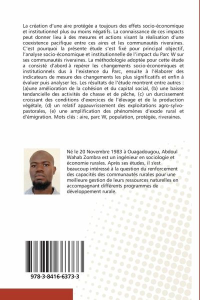 La création d'une aire protégée a toujours des effets socio-économique et institutionnel plus ou moins négatifs. La connaissance de ces impacts peut donner lieu à des mesures et actions visant la réalisation d'une coexistence pacifique entre ces aires et les communautés riveraines. C'est pourquoi la présente étude s'est fixé pour principal objectif, l'analyse socio-économique et institutionnelle de l'impact du Parc W sur ses communautés riveraines. La méthodologie adoptée pour cette étude a consisté d'abord à repérer les changements socio-économiques et institutionnels dus à l'existence du Parc, ensuite à l'élaborer des indicateurs de mesure des changements les plus significatifs et enfin à évaluer puis analyser les. Les résultats de l'étude montrent entre autres : (a)une amélioration de la cohésion et du capital social, (b) une baisse tendancielle des activités de chasse et de pêche, (c) un durcissement croissant des conditions d'exercices de l'élevage et de la production végétale, (d) un relatif appauvrissement des exploitations agro-sylvo-pastorales, (e) une amplification des phénomènes d'exode rural et d'émigration. Mots clés : aire, parc W, population, protégée, riveraines.