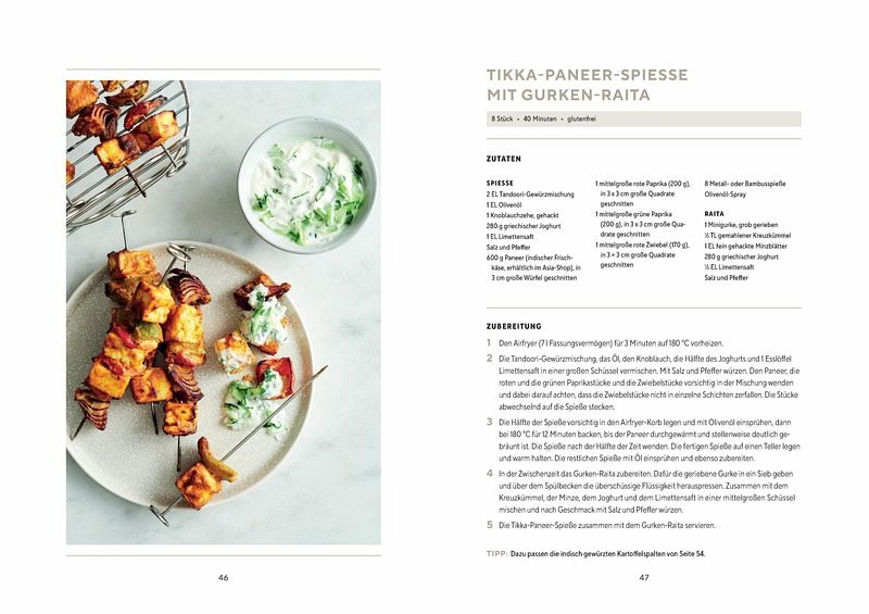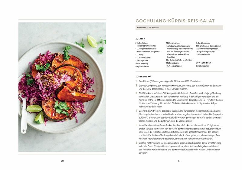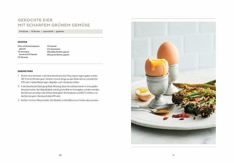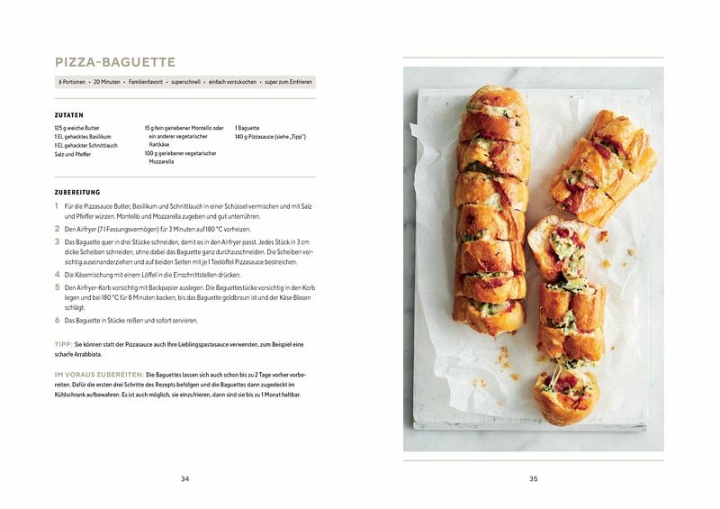 Mit der Heißluftfritteuse lassen sich köstliche vegetarische Gerichte schnell, gesund und total einfach zubereiten - und dies (fast) ohne Fett! Ob zum Frühstück, Mittag- oder Abendessen kommt der Airfryer zum Einsatz und zaubert lecker-gesunde Speisen wie ein mexikanisches Omelett mit Avocado-Salsa, Süßkartoffel-Samosas oder Tarte Tatin mit Karotten auf den Tisch. Auch kleinere Snacks für Zwischendurch können im Airfryer ratzfatz zubereitet werden. Leckere Nachspeisen wie Apfel- und Beerencrumble, Donuts mit Fruchtsoßen oder Bananen-Schoko-Muffins lassen die Herzen von Süßmäulern höher schlagen.
