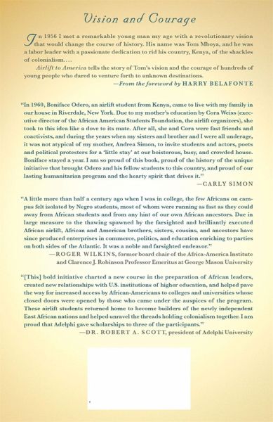 This is the long-hidden saga of how a handful of Americans and East Africans fought the British colonial government, the U.S. State Department, and segregation to transport to, or support at, U.S. and Canadian universities, between 1959 and 1963, nearly 800 young East African men and women who would go on to change their world and ours. The students supported included Barack Obama Sr., future father of a U.S. president, Wangari Maathai, future Nobel Peace Prize laureate, as well as the nation-builders of post-colonial East Africa -- cabinet ministers, ambassadors, university chancellors, clinic and school founders. The airlift was conceived by the unusual partnership of the charismatic, later-assassinated Kenyan Tom Mboya and William X. Scheinman, a young American entrepreneur, with supporting roles played by Jackie Robinson, Harry Belafonte, Sidney Poitier, and Martin Luther King, Jr. The airlift even had an impact on the 1960 presidential race, as Vice-President Richard Nixon tried to muscle the State Department into funding the project to prevent Senator Jack Kennedy from using his family foundation to do so and reaping the political benefit. The book is based on the files of the airlift's sponsor, the African American Students Foundation, untouched for almost fifty years.