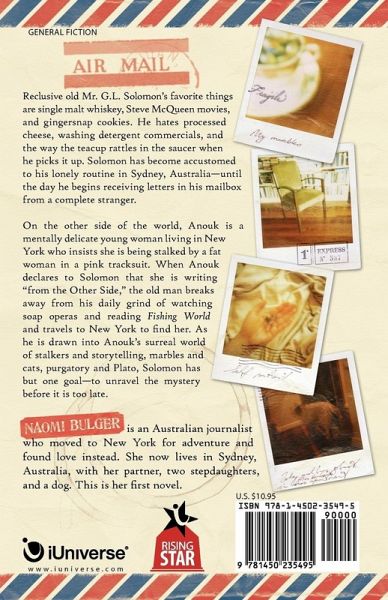 Reclusive old Mr. G.L. Solomon's favorite things are single malt whiskey, Steve McQueen movies, and gingersnap cookies. He hates processed cheese, washing detergent commercials, and the way the teacup rattles in the saucer when he picks it up. Solomon has become accustomed to his lonely routine in Sydney, Australia-until the day he begins sporadically receiving letters in his mailbox from a complete stranger. On the other side of the world, Anouk is a mentally delicate young woman living in New York who insists she is being stalked by a fat woman in a pink tracksuit. When Anouk declares to Solomon that she is writing "from the Other Side," the old man breaks away from his daily grind of watching soap operas and reading Fishing World and travels to New York to find her. As he is drawn into Anouk's surreal world of stalkers and storytelling, marbles and cats, purgatory and Plato, Solomon has but one goal-to unravel the mystery before it is too late. " ... A story of mismatched individuals in a world where magic touches the diurnal." -Christine Nagel Literary Services