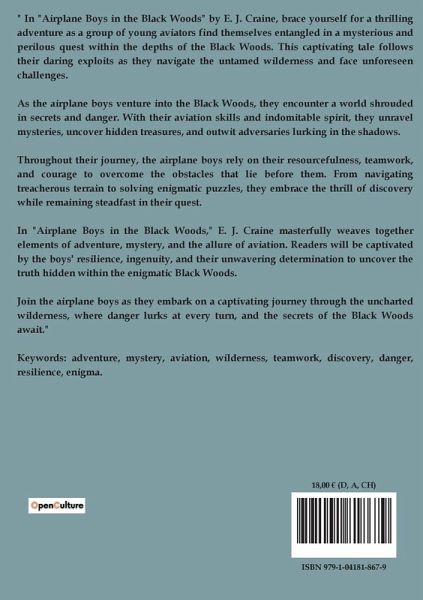 " In "Airplane Boys in the Black Woods" by E. J. Craine, brace yourself for a thrilling adventure as a group of young aviators find themselves entangled in a mysterious and perilous quest within the depths of the Black Woods. This captivating tale follows their daring exploits as they navigate the untamed wilderness and face unforeseen challenges. As the airplane boys venture into the Black Woods, they encounter a world shrouded in secrets and danger. With their aviation skills and indomitable spirit, they unravel mysteries, uncover hidden treasures, and outwit adversaries lurking in the shadows. Throughout their journey, the airplane boys rely on their resourcefulness, teamwork, and courage to overcome the obstacles that lie before them. From navigating treacherous terrain to solving enigmatic puzzles, they embrace the thrill of discovery while remaining steadfast in their quest. In "Airplane Boys in the Black Woods," E. J. Craine masterfully weaves together elements of adventure, mystery, and the allure of aviation. Readers will be captivated by the boys' resilience, ingenuity, and their unwavering determination to uncover the truth hidden within the enigmatic Black Woods. Join the airplane boys as they embark on a captivating journey through the uncharted wilderness, where danger lurks at every turn, and the secrets of the Black Woods await." Keywords: adventure, mystery, aviation, wilderness, teamwork, discovery, danger, resilience, enigma.