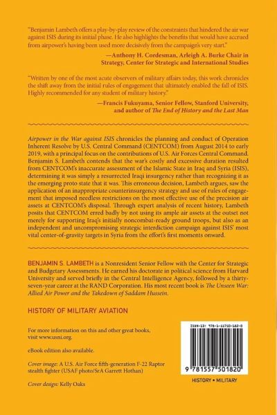 Airpower in the War against ISIS chronicles the planning and conduct of Operation Inherent Resolve by U.S. Central Command (CENTCOM) from August 2014 to mid-2018, with a principal focus on the contributions of U.S. Air Forces Central Command (AFCENT). Benjamin S. Lambeth contends that the war's costly and excessive duration resulted from CENTCOM's inaccurate assessment of the Islamic State in Iraq and Syria (ISIS), determining it was simply a resurrected Iraqi insurgency rather than recognizing it as the emerging proto-state that it actually was. This erroneous decision, Lambeth argues, saw the application of an inappropriate counterinsurgency strategy and use of rules of engagement that imposed needless restrictions on the most effective use of the precision air assets at CENTCOM's disposal. The author, through expert analysis of recent history, forcefully argues that CENTCOM erred badly by not using its ample air assets at the outset not merely for supporting Iraq's initially noncombat-ready ground troops but also in an independent and uncompromising strategic interdiction campaign against ISIS's most vital center-of-gravity targets in Syria from the effort's first moments onward.