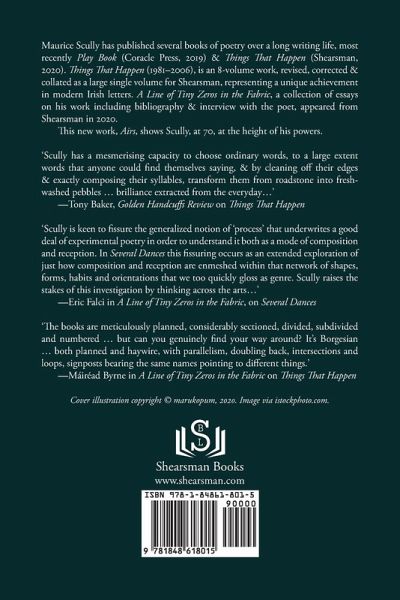 Maurice Scully has published several books of poetry over a long writing life, most recently Play Book (Coracle Press, 2019) & Things That Happen (Shearsman, 2020). Things That Happen (1981-2006), is an 8-volume work, revised, corrected & collated as a large single volume for Shearsman, representing a unique achievement in modern Irish letters. A Line of Tiny Zeros in the Fabric, a collection of essays on his work including bibliography & interview with the poet, appeared from Shearsman in 2020.This new work, Airs, shows Scully, at 70, at the height of his powers. 'Scully has a mesmerising capacity to choose ordinary words, to a large extent words that anyone could find themselves saying, & by cleaning off their edges & exactly composing their syllables, transform them from roadstone into fresh-washed pebbles ... brilliance extracted from the everyday...' -Tony Baker, Golden Handcuffs Review on Things That Happen 'Scully is keen to fissure the generalized notion of 'process' that underwrites a good deal of experimental poetry in order to understand it both as a mode of composition and reception. In Several Dances this fissuring occurs as an extended exploration of just how composition and reception are enmeshed within that network of shapes, forms, habits and orientations that we too quickly gloss as genre. Scully raises the stakes of this investigation by thinking across the arts...' -Eric Falci in A Line of Tiny Zeros in the Fabric, on Several Dances 'The books are meticulously planned, considerably sectioned, divided, subdivided and numbered ... but can you genuinely find your way around? It's Borgesian ... both planned and haywire, with parallelism, doubling back, intersections and loops, signposts bearing the same names pointing to different things.' -Máiréad Byrne in A Line of Tiny Zeros in the Fabric on Things That Happen