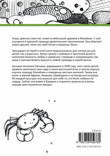 Aisha is a young girl living in a Kampong in Malaysia and experiences wonderful adventures in nature. She finds many new friends such as the little crab Ketam or the lizard Lissi. The 13 stories of this book are suitable for reading to children and also for self reading for adults of each age. The writer is able to introduce bring young and older readers closer to respect of animals and nature besides the exciting adventure stories. To feel closer and to protect nature is the strong wish of the writer.