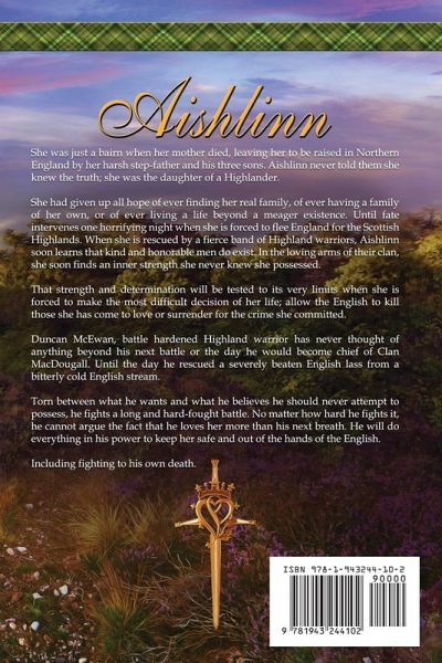AISHLINN IS THE SWEET/NON-STEAMY VERSION OF LAIDEN'S DAUGHTER. She was just a bairn when her mother died, leaving her to be raised in Northern England by her harsh step-father and his three sons. Aishlinn never told them she knew the truth; she was the daughter of a Highlander. She had given up all hope of ever finding her real family, of ever having a family of her own, or of ever living a life beyond a meager existence. Until fate intervenes one horrifying night when she is forced to flee England for the Scottish Highlands. When she is rescued by a fierce band of Highland warriors, Aishlinn soon learns that kind and honorable men do exist. In the loving arms of their clan, she soon finds an inner strength she never knew she possessed. That strength and determination will be tested to its very limits when she is forced to make the most difficult decision of her life; allow the English to kill those she has come to love or surrender for the crime she committed. Duncan McEwan, battle hardened Highland warrior has never thought of anything beyond his next battle or the day he would become chief of Clan MacDougall. Until the day he rescued a severely beaten English lass from a bitterly cold English stream. Torn between what he wants and what he believes he should never attempt to possess, he fights a long and hard-fought battle. No matter how hard he fights it, he cannot argue the fact that he loves her more than his next breath. He will do everything in his power to keep her safe and out of the hands of the English.