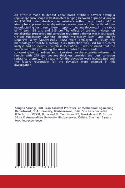 An effort is made to deposit Cobalt-based Stellite 6 powder having a regular spherical shape with diameters ranging between 15mim to 45mim on an AISI 304 rolled stainless steel substrate without any bond coat.The atmospheric plasma spray deposition process was adopted with additive manufacturing for three different types of coating thickness in the range of 74 mim, 128 mim, and 215 mim..The effect of coating thickness on metallurgical properties and corrosion resistance behavior was investigated. Optical microscopy, Scanning Electron Microscopy (SEM), and Energy Dispersive X-ray Spectroscopy (EDS) were employed to study the morphology of Stellite 6 coating. XRay Diffraction was used for structural analysis and to identify the phase formation. It was observed that the sample with 128 mim coating thickness provides the best resultconcerning micro hardness and micro structure characteristics whereas the sample with 215 mim coating thickness provides the best corrosion resistance property. The reasons for the deviation were investigated and the factors responsible for the deviation were assigned in this investigation.