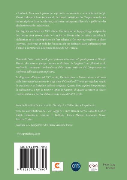 Gwladys Le Cuff et Anne Lepoittevin : Une synthèse sur les inscriptions des décors post-tridentins - Patrizia Tosini : Antico Testamento, erudizione e propaganda nell'Appartamento di Belvedere di Pio IV in Vaticano - Ralph Dekoninck : Genèse et postérité gravée du cycle martyrologique de Santo Stefano Rotondo - Sílvia Canalda Llobet : Una proposta di ricostruzione del ciclo pittorico dei chiostri di San Pietro in Montorio - Florian Métral : Textes et images dans la chapelle de la Trinité de l'église du Gesù - Corinna Gallori : Un'iscrizione protagonista: il Nome di Gesù e la sua adorazione nelle pale d'altare italiane della seconda metà del Cinquecento - Francesco Sorce : I colori della citazione. L'intertestualità nei dipinti di Cerano - Luca Baroni : Per istruttione del modo di veder il quadro » : Federico Barocci e le iscrizioni nelle immagini sacre monumentali - Pierre-Antoine Fabre .