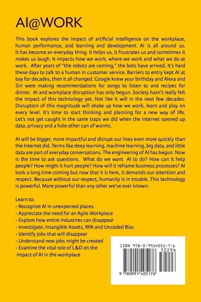 This book explores the impact of artificial intelligence on the workplace, human performance, and learning and development. AI is all around us. It has become an everyday thing. It helps us, it frustrates us and sometimes it makes us laugh. It impacts how we work, where we work and what we do at work. After years of "the robots are coming," the bots have arrived. It's hard these days to talk to a human in customer service. Barriers to entry kept AI at bay for decades, then it all changed. Google knew your birthday and Alexa and Siri were making recommendations for songs to listen to and recipes for dinner. AI and workplace disruption has only begun. Society hasn't really felt the impact of this technology yet. Not like it will in the next few decades. Disruption of this magnitude will shake up how we work, learn and play on every level. It's time to start thinking and planning for a new way of life. Let's not get caught in the same traps we did when the Internet opened up data, privacy and a hole other can of worms. AI will be bigger, more impactful and disrupt our lives even more quickly than the Internet did. Terms like deep learning, machine learning, big data, and little data are part of everyday conversations. The engineering of AI has begun. Now is the time to ask questions. What do we want AI to do? How can it help people? How might it hurt people? How will it reframe business processes? AI took a long time coming but now that it is here, it demands our attention and respect. Because without our respect, humanity is in trouble. This technology is powerful. More powerful than any other we've ever known