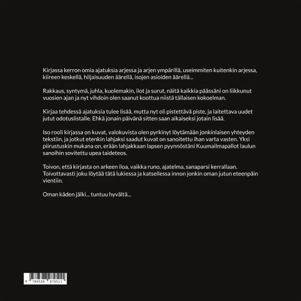 Kirjassa kerron omia ajatuksia arjessa ja arjen ympärillä, useimmiten kuitenkin arjessa, kiireen keskellä, hiljaisuuden äärellä, isojen asioiden äärellä... Rakkaus, syntymä, juhla, kuolemakin, ilot ja surut, näitä kaikkia päässäni on liikkunut vuosien ajan ja nyt vihdoin olen saanut koottua niistä tällaisen kokoelman. Kirjaa tehdessä ajatuksia tulee lisää, mutta nyt oli pistettävä piste, ja laitettava uudet jutut odotuslistalle. Ehkä jonain päivänä sitten saan aikaiseksi jotain lisää. Iso rooli kirjassa on kuvat, valokuvista olen pyrkinyt löytämään jonkinlaisen yhteyden tekstiin, ja jotkut etenkin lahjaksi saadut kuvat on sanoitettu ihan varta vasten. Yksi piirustuskin mukana on, erään lahjakkaan lapsen pyynnöstäni Kuumailmapallot laulun sanoihin sovitettu upea taideteos. Toivon, että kirjasta on arkeen iloa, vaikka runo, ajatelma, sanaparsi kerrallaan. Toivottavasti joku löytää tätä lukiessa ja katsellessa innon jonkin oman jutun eteenpäin vientiin. Oman käden jälki... tuntuu hyvältä...