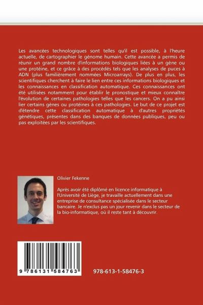 Les avancées technologiques sont telles qu'il est possible, à l'heure actuelle, de cartographier le génome humain. Cette avancée a permis de réunir un grand nombre d'informations biologiques liées à un gène ou une protéine, et ce grâce à des procédés tels que les analyses de puces à ADN (plus familièrement nommées Microarrays). De plus en plus, les scientifiques cherchent à faire le lien entre ces informations biologiques et les connaissances en classification automatique. Ces connaissances ont été utilisées notamment pour établir le pronostique et mieux connaître l'évolution de certaines pathologies telles que les cancers. On a pu ainsi lier certains gènes ou protéines à ces pathologies. Le but de ce projet est d'étendre cette classification automatique à d'autres propriétés génétiques, présentes dans des banques de données publiques, peu ou pas exploitées par les scientifiques.