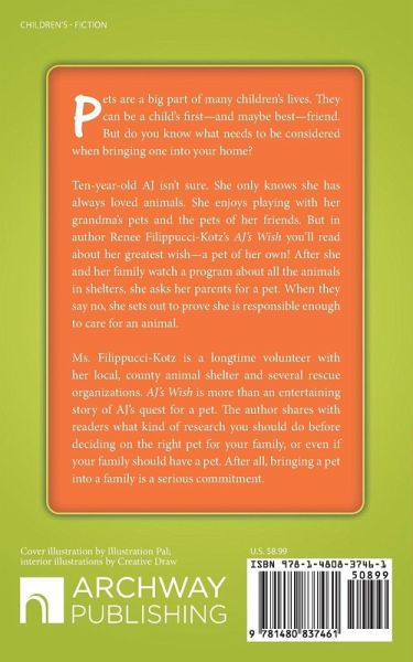 Pets are a big part of many children's lives. They can be a child's first-and maybe best-friend. But do you know what needs to be considered when bringing one into your home? Ten-year-old AJ isn't sure. She only knows she has always loved animals. She enjoys playing with her grandma's pets and the pets of her friends. But in author Renee Filippucci-Kotz's AJ's Wish you'll read about her greatest wish-a pet of her own! After she and her family watch a program about all the animals in shelters, she asks her parents for a pet. When they say no, she sets out to prove she is responsible enough to care for an animal. Ms. Filippucci-Kotz is a longtime volunteer with her local, county animal shelter and several rescue organizations. AJ's Wish is more than an entertaining story of AJ's quest for a pet. The author shares with readers what kind of research you should do before deciding on the right pet for your family, or even if your family should have a pet. After all, bringing a pet into a family is a serious commitment.