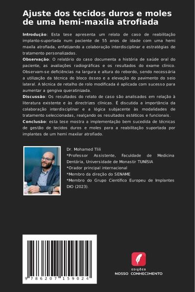 Introdução: Esta tese apresenta um relato de caso de reabilitação implanto-suportada num paciente de 55 anos de idade com uma hemi maxila atrofiada, enfatizando a colaboração interdisciplinar e estratégias de tratamento personalizadas.Observação: O relatório do caso documenta a história de saúde oral do paciente, as avaliações radiográficas e os resultados do exame clínico. Observam-se deficiências na largura e altura do rebordo, sendo necessária a utilização da técnica do bloco ósseo e a elevação do pavimento do seio lateral. A técnica de retalho de rolo modificada é aplicada com sucesso para aumentar a gengiva queratinizada.Discussão: Os resultados do relato de caso são analisados em relação à literatura existente e às directrizes clínicas. É discutida a importância da colaboração interdisciplinar e a lógica subjacente às modalidades de tratamento seleccionadas, realçando os resultados estéticos e funcionais.Conclusão: esta tese mostra a implementação bem sucedida de técnicas de gestão de tecidos duros e moles para a reabilitação suportada por implantes de um hemi maxilar atrofiado.