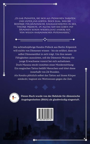"Es gab Monster, die sich als Menschen tarnten und unter uns lebten. Doch egal, was die Behörde für dämonische Angelegenheiten predigte, im Alltag sah das Zusammenleben mit Dämonen ganz anders aus. Von wegen harmonisches Miteinander." Die achtzehnjährige Kendra Pollock aus Berlin-Köpenick will nichts von Dämonen wissen, bis sie erfährt, dass sie selbst Dämonenblut in sich trägt. Um ihre neuen Fähigkeiten auszuloten, nimmt die Dämonin Marana die junge Erwachsene vorerst bei sich auf. Doch Marana steckt inmitten einer Mordermittlung: Ein magisches Tattoo befällt Menschen und tötet diese innerhalb von 24 Stunden. Als Kendra plötzlich selbst das Tattoo auf ihrem Körper entdeckt, beginnt ein Wettrennen gegen die Zeit. Dieses Buch wurde von der Behörde für dämonische Angelegenheiten (BfdA) als glaubwürdig eingestuft.