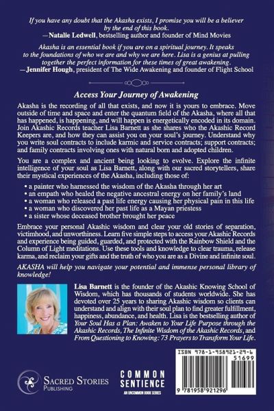 Access Your Journey of Awakening Akasha is the recording of all that exists and now it is yours to embrace. Move outside of time and space and enter the quantum field of the Akasha, where all that has happened, is happening, and will happen is energetically encoded in its domain. Join Akashic Records teacher Lisa Barnett as she shares who the Akashic Record Keepers are, and how they can assist you on your soul's journey. Understand why you write soul contracts to include karmic and service contracts; support contracts; and family contracts involving ones with natural born and adopted children. You are a complex and ancient being looking to evolve. Explore the infinite intelligence of your soul as Lisa Barnett, along with our sacred storytellers, share their mystical experiences of the Akasha, including those of: · a painter who harnessed the wisdom of the Akasha through her art · an empath who healed the negative ancestral energy on her family's land · a woman who released a past life energy causing her physical pain in this life · a woman who discovered her past life as a Mayan priestess · a sister whose deceased brother brought her peace Embrace your personal Akashic wisdom and clear your old stories of separation, victimhood, and unworthiness. Learn five simple steps to access your Akashic Records and experience being guided, guarded, and protected with the Rainbow Shield and the Column of Light meditations. Use these tools and knowledge to clear trauma, release karma, and reclaim your gifts and the truth of who you are as a Divine and infinite soul. AKASHA will help you navigate your potential and immense personal library of knowledge! ¿¿¿AKASHA: Spiritual Experiences of Accessing the Infinite Intelligence of Our Souls is part of Common Sentience, an uncommon book series that brings the mystical into the mainstream by sharing spiritual wisdom and true, personal stories of the Divine experiences many are having. Look for other books in this exciting series at sacredstories.com.