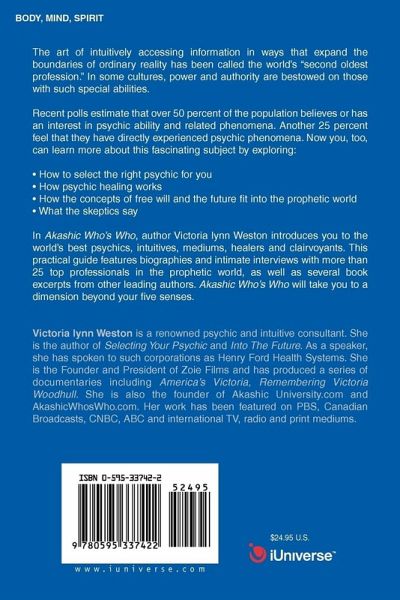 The art of intuitively accessing information in ways that expand the boundaries of ordinary reality has been called the world's "second oldest profession." In some cultures, power and authority are bestowed on those with such special abilities. Recent polls estimate that over 50 percent of the population believes or has an interest in psychic ability and related phenomena. Another 25 percent feel that they have directly experienced psychic phenomena. Now you, too, can learn more about this fascinating subject by exploring: How to select the right psychic for you How psychic healing works How the concepts of free will and the future fit into the prophetic world What the skeptics say In Akashic Who's Who, author Victoria lynn Weston introduces you to the world's best psychics, intuitives, mediums, healers and clairvoyants. This practical guide features biographies and intimate interviews with more than 25 top professionals in the prophetic world, as well as several book excerpts from other leading authors. Akashic Who's Who will take you to a dimension beyond your five senses.