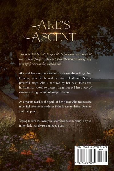 'You must kill her, elf. Kings will rise and fall, and they will want a powerful queen. You will spend the next centuries giving your life for hers as they seek her out.' Ake and her son are destined to defeat the evil goddess Drianna, who has hunted her since childhood. Now a powerful mage, Ake is tortured by her past. Her elven husband has vowed to protect them, but evil has a way of sinking its fangs in and refusing to let go. As Drianna reaches the peak of her power Ake realizes she must fight for those she loves if she is ever to defeat Drianna and find peace. Trying to save the man you love while he is consumed by an inner darkness always comes at a cost....