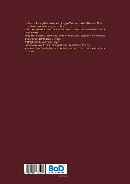 In diesem Buch geht es um einen jungen Wolfsmenschen Namens Akira.Erzählt wird seine Lebensgeschichte.Was Er für Gefahren durchmacht und wie Er dann doch letztendlich seine Liebe Findet.Begleitet in dieser Geschichte wird Er von seiner Mutter, seinen Freunden und seiner zukünftigen Freundin.Verfolgt wird Er von einem Jäger.Lasst euch einfach mit in eine Welt voller Fantasie entführen.Animiert diese Geschichte zu schreiben, wurde ich durch eine Anime-Serie inspiriert.
