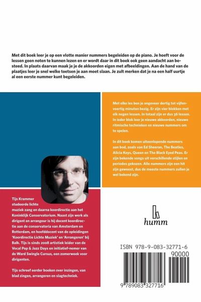 Met dit boek leer je op een vlotte manier nummers begeleiden op de piano. Je hoeft voor de lessen geen noten te kunnen lezen dus daar besteden we in dit boek ook geen aandacht aan. Je leert de akkoorden aan de hand van afbeeldingen. Op deze manier leer je de akkoorden snel. Je zult zien dat je na een half uurtje al je eerste nummer kunt begeleiden. Met elke les ben je ongeveer dertig tot vijfenveertig minuten bezig. Er zijn vier blokken met elk negen lessen. In totaal zijn er dus 36 lessen. In ieder blok leer je nieuwe akkoorden, nieuwe ritmische technieken en nieuwe nummers om te spelen. In dit boek komen uiteenlopende nummers aan bod, zoals van Ed Sheeran, The Beatles, Alicia Keys, Queen en The Black Eyed Peas. Er zijn bekende songs uit verschillende stijlen en periodes gekozen. Alle nummers zijn een hit zijn geweest, dus de meeste nummers zullen je wel bekend zijn.
