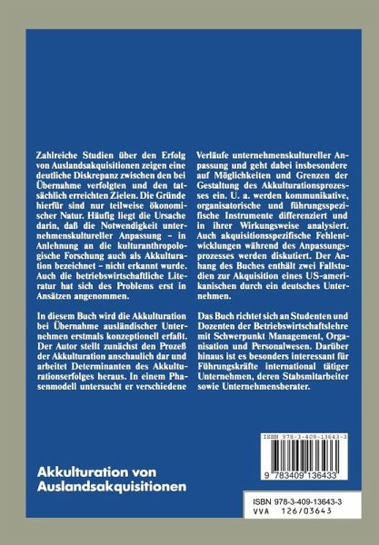 Die Bedeutung von Unternehmens übernahmen im Ausland für die Forcierung der Internationalisierung vieler Unternehmungen und die Erreichung der damit verbundenen strategischen Zie le ist in jüngster Zeit häufig betont worden. Nicht selten wird bereits von einer "Akquisitionswelle" gesprochen. Die meisten Studien über den Erfolg von Auslandsakquisitionen zeigen jedoch eine deutliche Diskrepanz zwischen den ur sprünglich mit der Übernahme verfolgten und den tatsächlich erreichten Zielen. Vor diesem Hintergrund wird in dem vorliegenden Beitrag die These untersucht, daß nicht nur die rein wirtschaftlichen Erfolgsfaktoren für eine erfolgreiche Übernahme gegeben sein müssen, sondern daß dafür als eine weitere notwendige Voraussetzung eine funktionale Bewältigung der Probleme un ternehmenskultureller Anpassung angesehen werden kann. Die unternehmenskul turelle Anpassung wird in Anlehnung an kul turanthropologische Konzepte auch als Akkulturation be zeichnet. Da zur Problematik der Akkulturation von Aus landsakquisitionen bislang kaum Untersuchungen durchgeführt wurden, besteht ein Hauptanliegen der Arbeit darin, diesen Themenbereich konzeptionell zu erfassen. Dies beinhaltet auch die Diskussion von Möglichkeiten und Grenzen einer be wußten Beeinflussung des Akkul turationsprozesses. Zwei Fallstudien zur speziellen Problematik der Akquisition ame rikanischer durch deutsche Unternehmungen schließen sich an. Die Abfassung der vorliegenden Arbeit war nur mit Unter stützung verschiedener Personen und Institutionen möglich.
