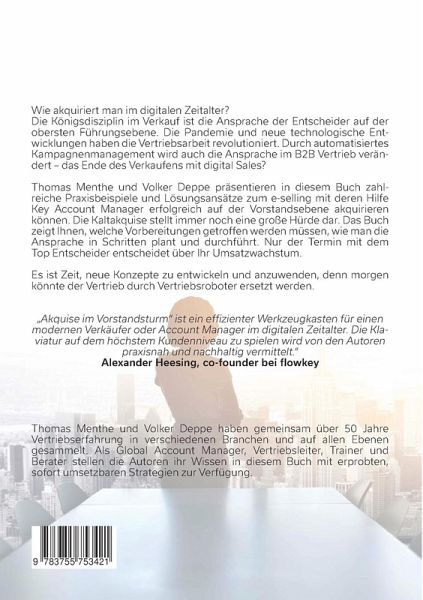 Im Zeitalter der Akquise über soziale Medien und E-Mail ist es schwieriger geworden, an die Top-Entscheider heranzukommen. Lesen Sie in diesem Buch wie man dennoch erfolgreich Termine mit dem Vorstand akquirieren kann, obwohl der telefonische Kanal fast nicht mehr funktioniert. Die Autoren zeigen, wie man praxiserprobte Tricks erfolgreich anwenden kann. Von der Vorbereitung bis zur E-Mail Formulierung findet der Verkäufer hilfreiche Praxis Tipps.