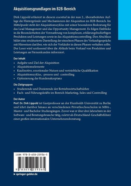 Dirk Lippold erläutert in diesem essential in der nun 2., überarbeiteten Auflage die Hintergründe und Mechanismen der Akquisition im B2B-Bereich. Im Mittelpunkt steht der Akquisitionszyklus mit seiner besonderen Bedeutung für das Lead Management und das Opportunity Management. Es folgen Einblicke in die Besonderheiten der Vermarktung von komplexen, erklärungsbedürftigen Produkten und Leistungen sowie in das Akquisitionscontrolling. Den Abschluss bildet eine strukturierte Darstellung der einzelnen Phasen des Verkaufsgesprächs mit Hinweisen darüber, wie sich der Verkäufer in diesen Phasen verhalten sollte. Der Leser wird umfassend über die Abläufe beim Verkauf von Produkten und Leistungen an Firmenkunden informiert.