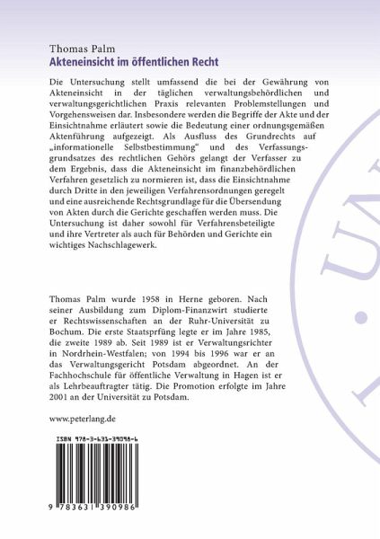 Der Autor: Thomas Palm wurde 1958 in Herne geboren. Nach seiner Ausbildung zum Diplom-Finanzwirt studierte er Rechtswissenschaften an der Ruhr-Universität zu Bochum. Die erste Staatsprüfung legte er im Jahre 1985, die zweite 1989 ab. Seit 1989 ist er Verwaltungsrichter in Nordrhein-Westfalen; von 1994 bis 1996 war er an das Verwaltungsgericht Potsdam abgeordnet. An der Fachhochschule für öffentliche Verwaltung in Hagen ist er als Lehrbeauftragter tätig. Die Promotion erfolgte im Jahre 2001 an der Universität zu Potsdam.